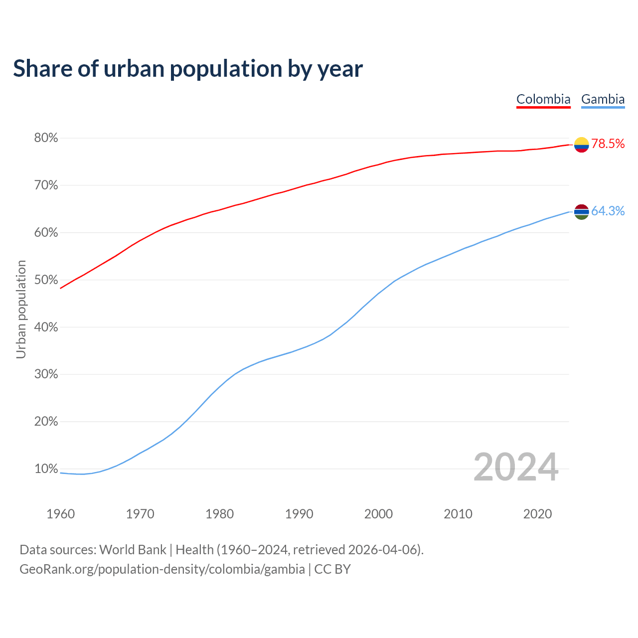 From 2004 to 2024, the share of urban population changed from 75.8% to 78.5% in Colombia and from 51.5% to 64.3% in the Gambia.