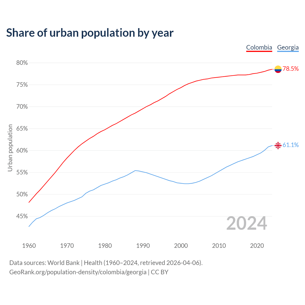 From 2004 to 2024, the share of urban population changed from 75.8% to 78.5% in Colombia and from 52.7% to 61.1% in Georgia.