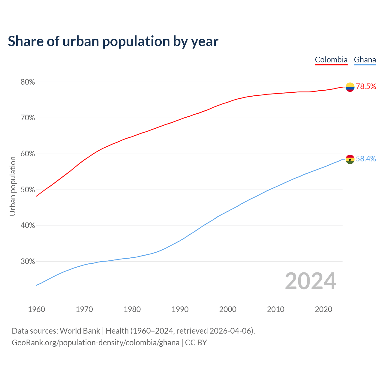 From 2004 to 2024, the share of urban population changed from 75.8% to 78.5% in Colombia and from 46.8% to 58.4% in Ghana.