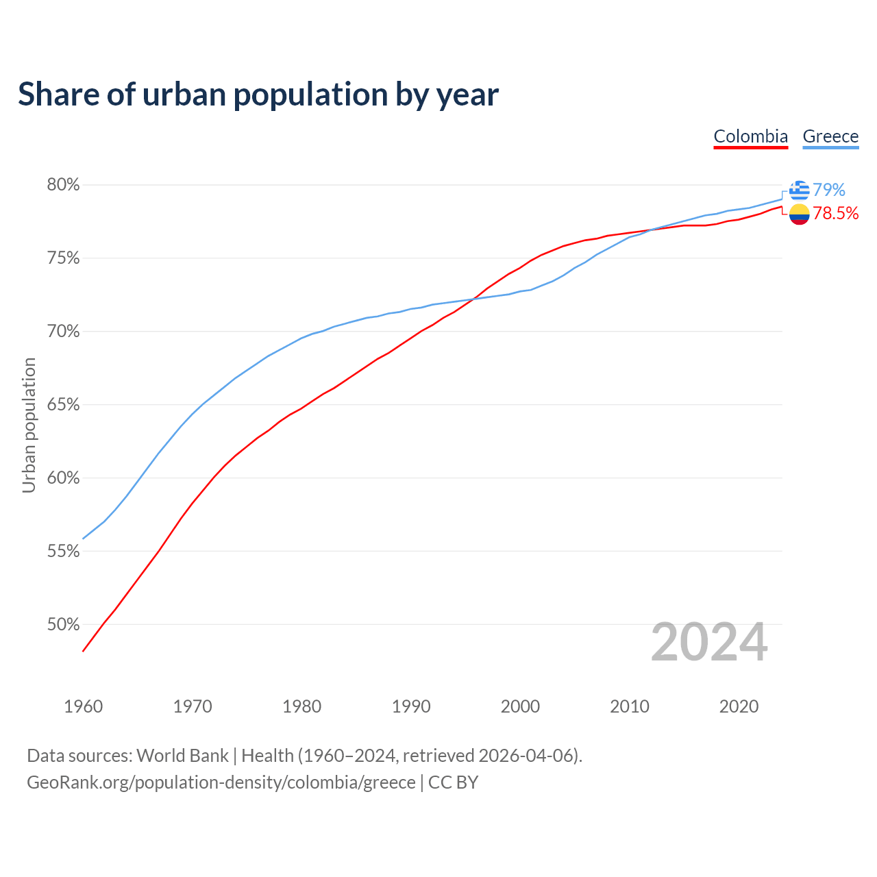 From 2004 to 2024, the share of urban population changed from 75.8% to 78.5% in Colombia and from 73.8% to 79% in Greece.