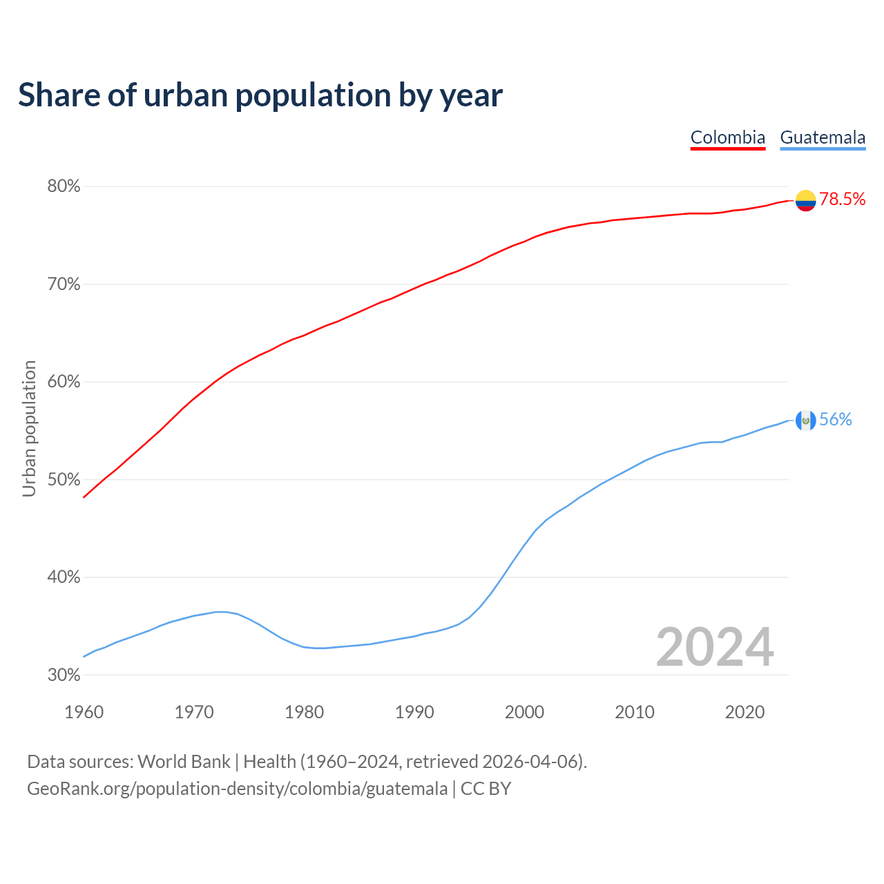 From 2004 to 2024, the share of urban population changed from 75.8% to 78.5% in Colombia and from 47.3% to 56% in Guatemala.