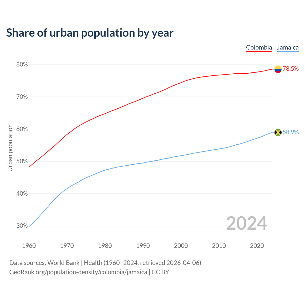 From 2004 to 2024, the share of urban population changed from 75.8% to 78.5% in Colombia and from 52.6% to 58.9% in Jamaica.