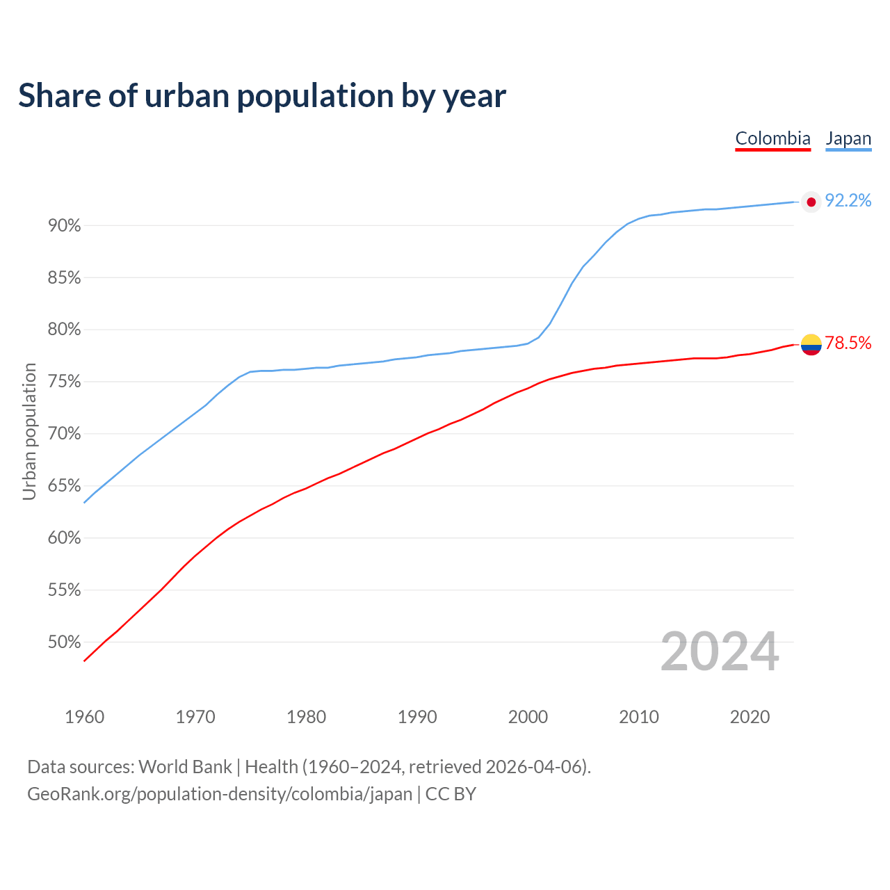 From 2004 to 2024, the share of urban population changed from 75.8% to 78.5% in Colombia and from 84.4% to 92.2% in Japan.