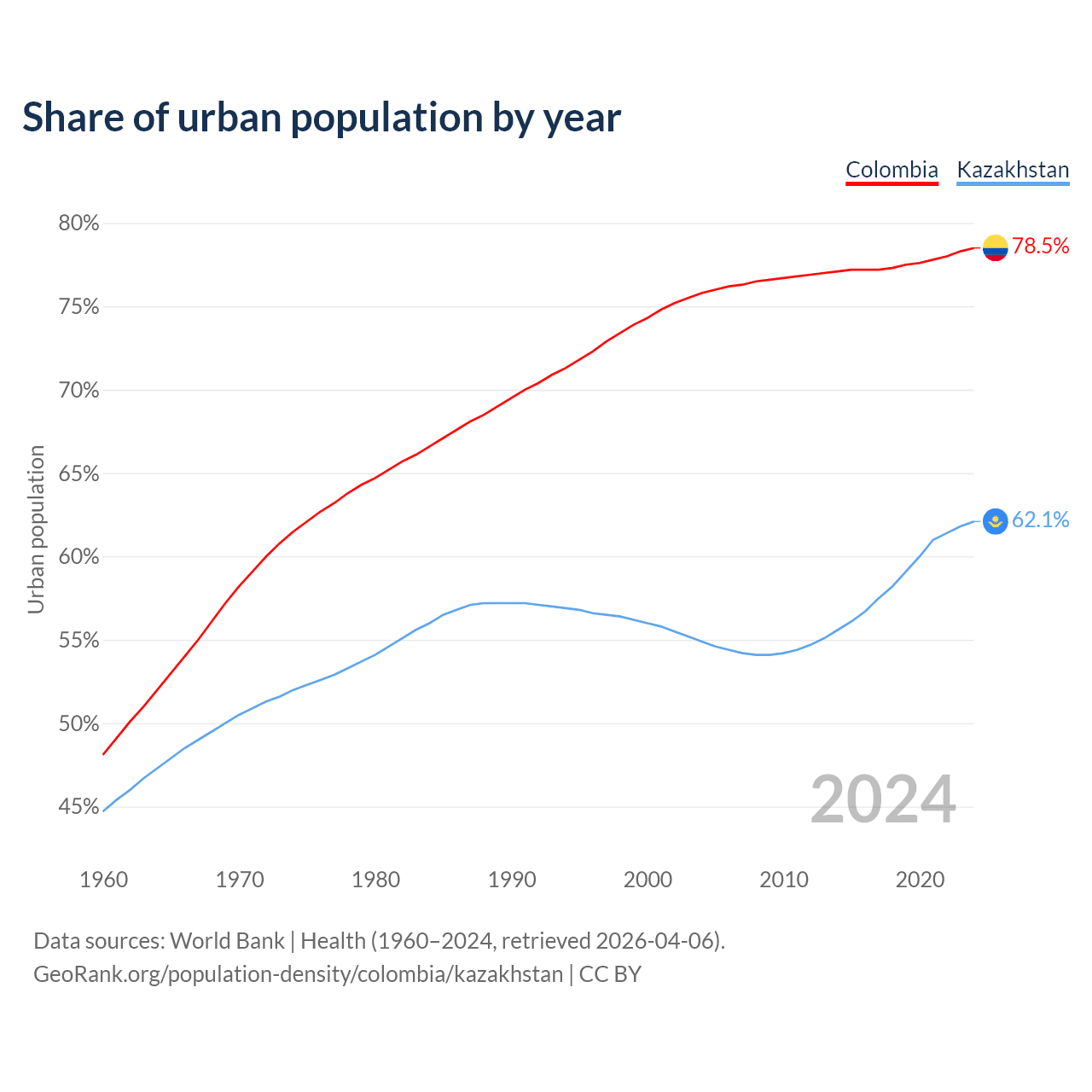 From 2004 to 2024, the share of urban population changed from 75.8% to 78.5% in Colombia and from 54.9% to 62.1% in Kazakhstan.