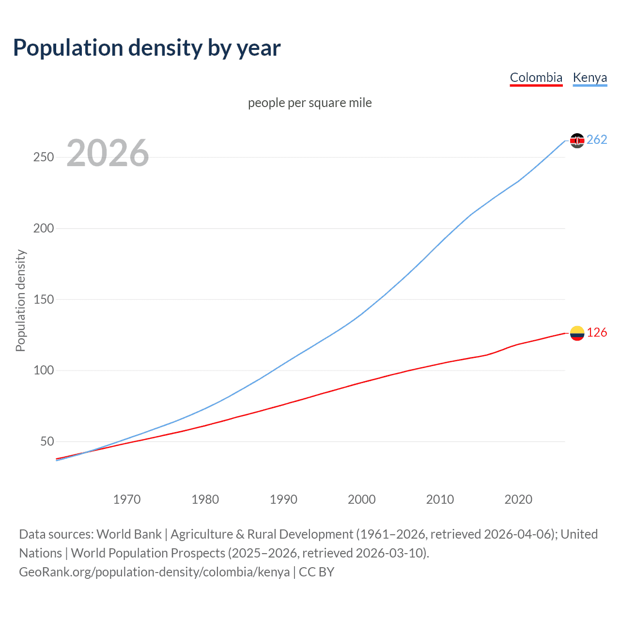 From 2006 to 2026, population density in Colombia increased by 26.4%, compared to a 55.7% growth in Kenya.