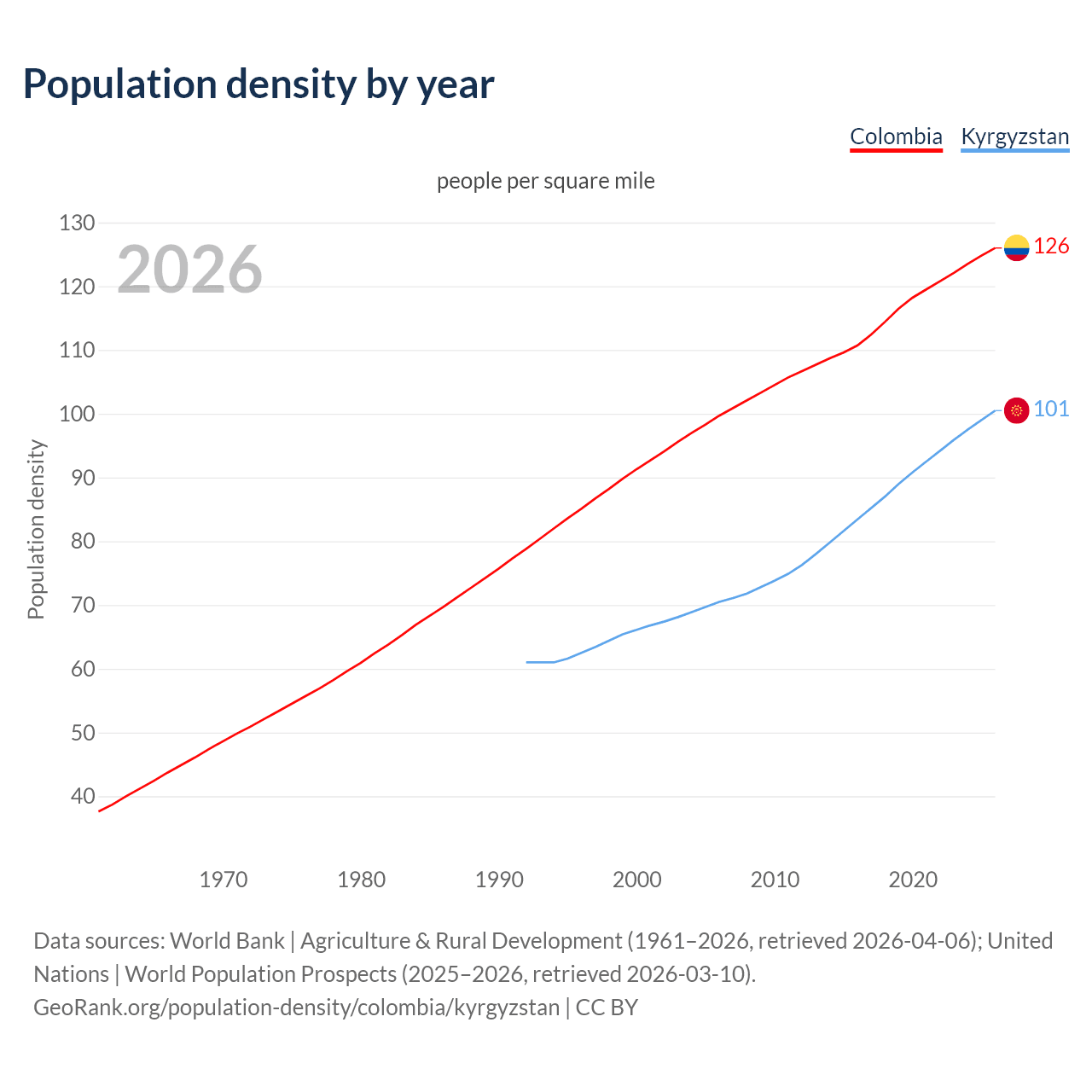 From 2006 to 2026, population density in Colombia increased by 26.4%, compared to a 42.6% growth in Kyrgyzstan.