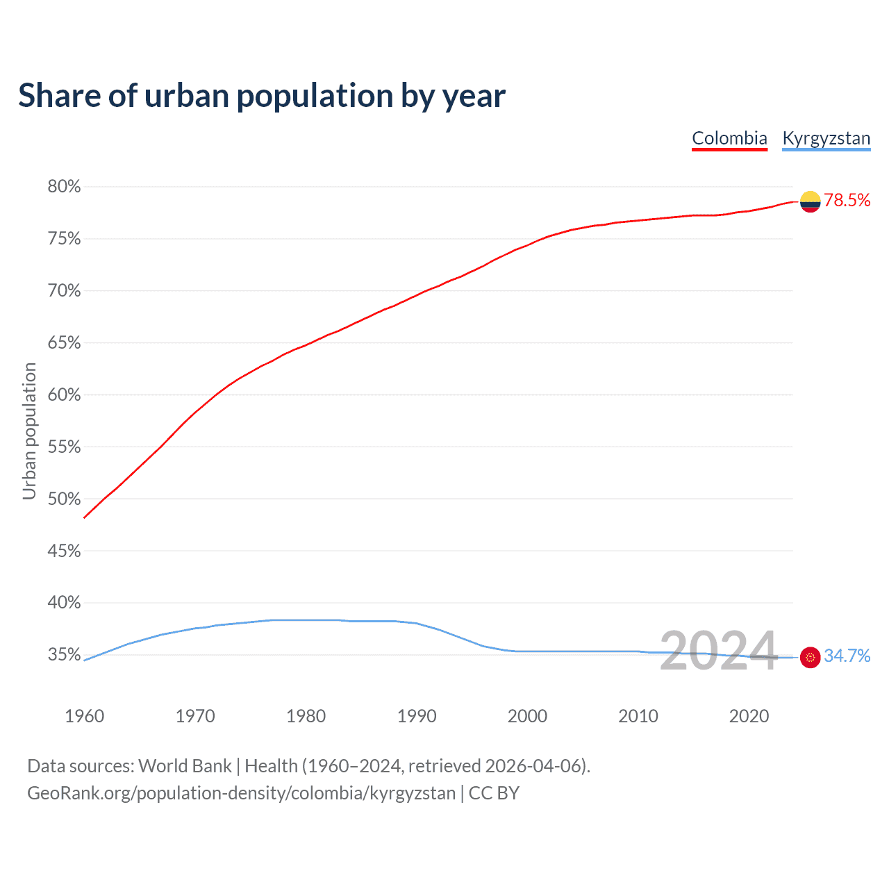 From 2004 to 2024, the share of urban population changed from 75.8% to 78.5% in Colombia and from 35.3% to 34.7% in Kyrgyzstan.