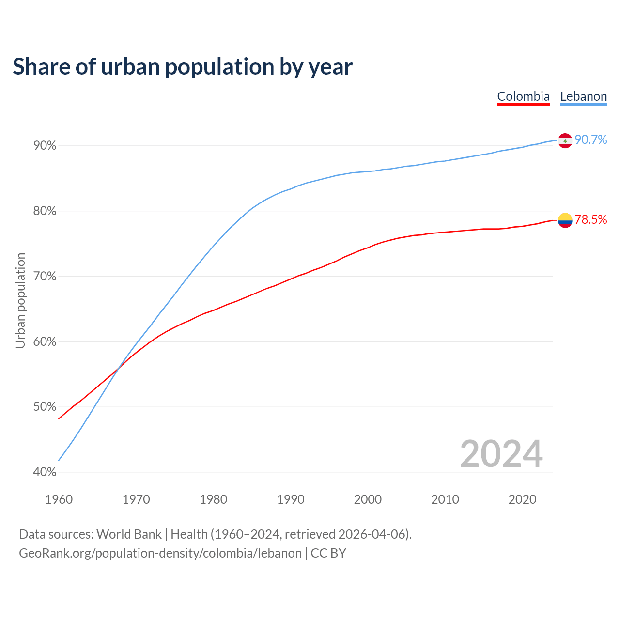 From 2004 to 2024, the share of urban population changed from 75.8% to 78.5% in Colombia and from 86.6% to 90.7% in Lebanon.