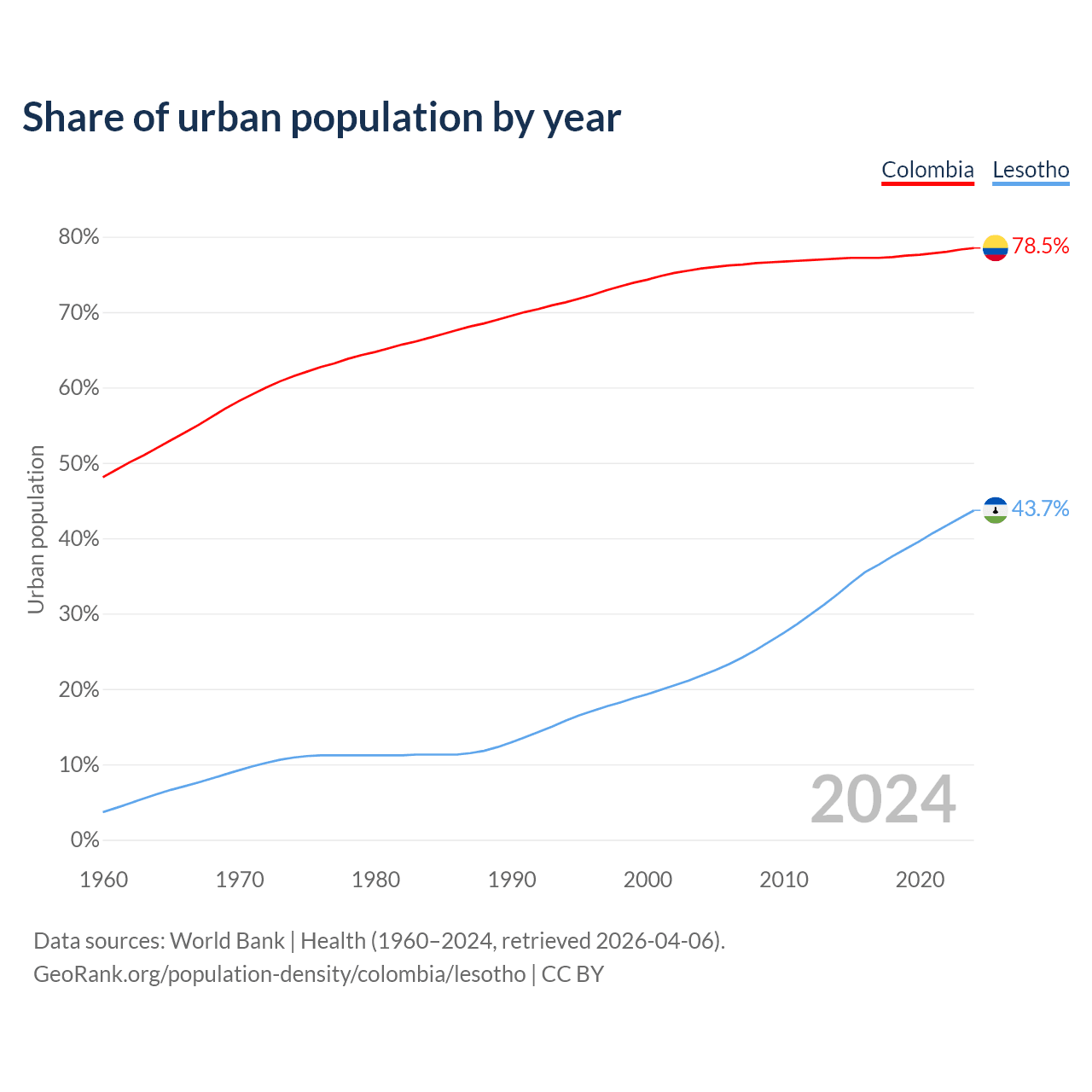 From 2004 to 2024, the share of urban population changed from 75.8% to 78.5% in Colombia and from 21.8% to 43.7% in Lesotho.