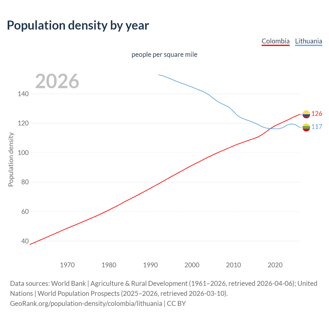 From 2006 to 2026, population density in Colombia increased by 26.4%, compared to a 13.3% decline in Lithuania.