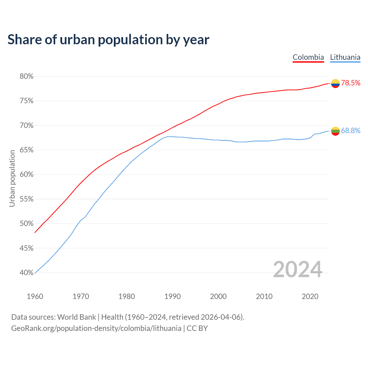 From 2004 to 2024, the share of urban population changed from 75.8% to 78.5% in Colombia and from 66.6% to 68.8% in Lithuania.