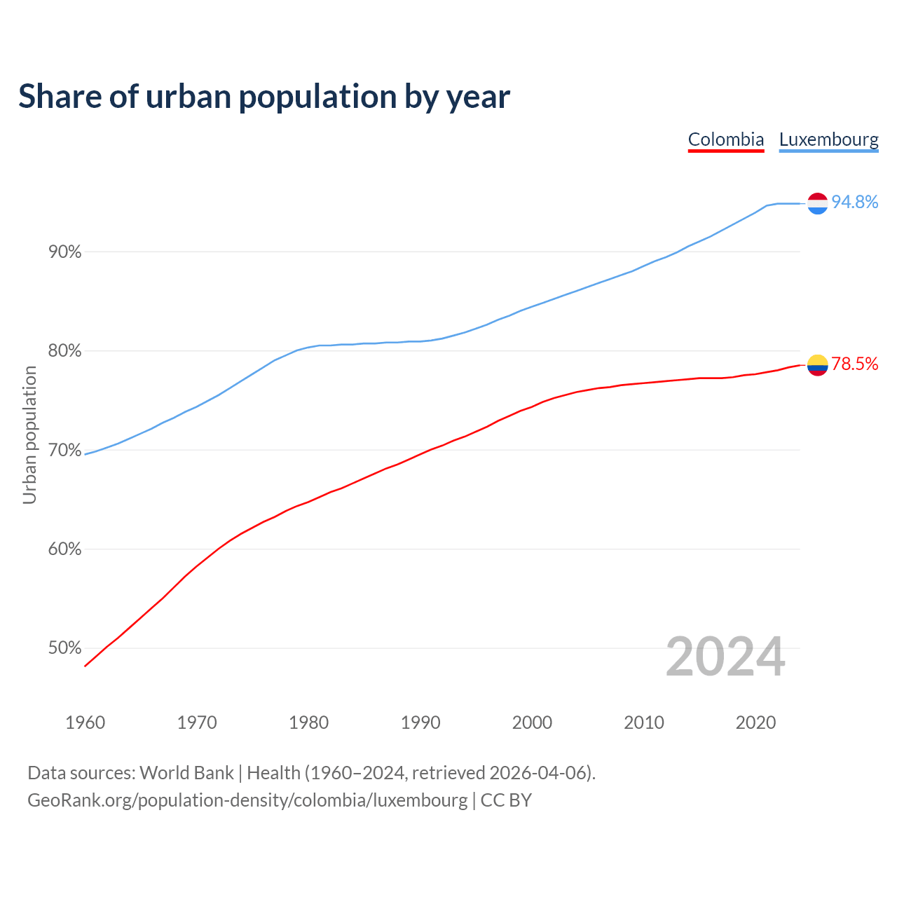 From 2004 to 2024, the share of urban population changed from 75.8% to 78.5% in Colombia and from 86% to 94.8% in Luxembourg.