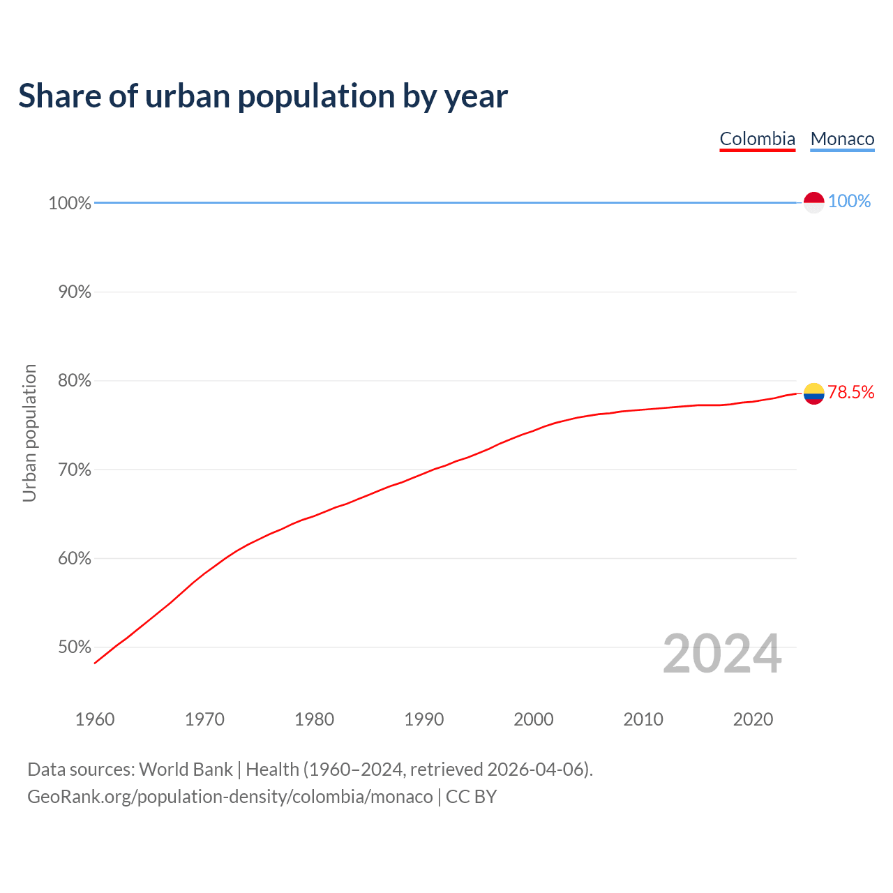 From 2004 to 2024, the share of urban population changed from 75.8% to 78.5% in Colombia and from 100% to 100% in Monaco.