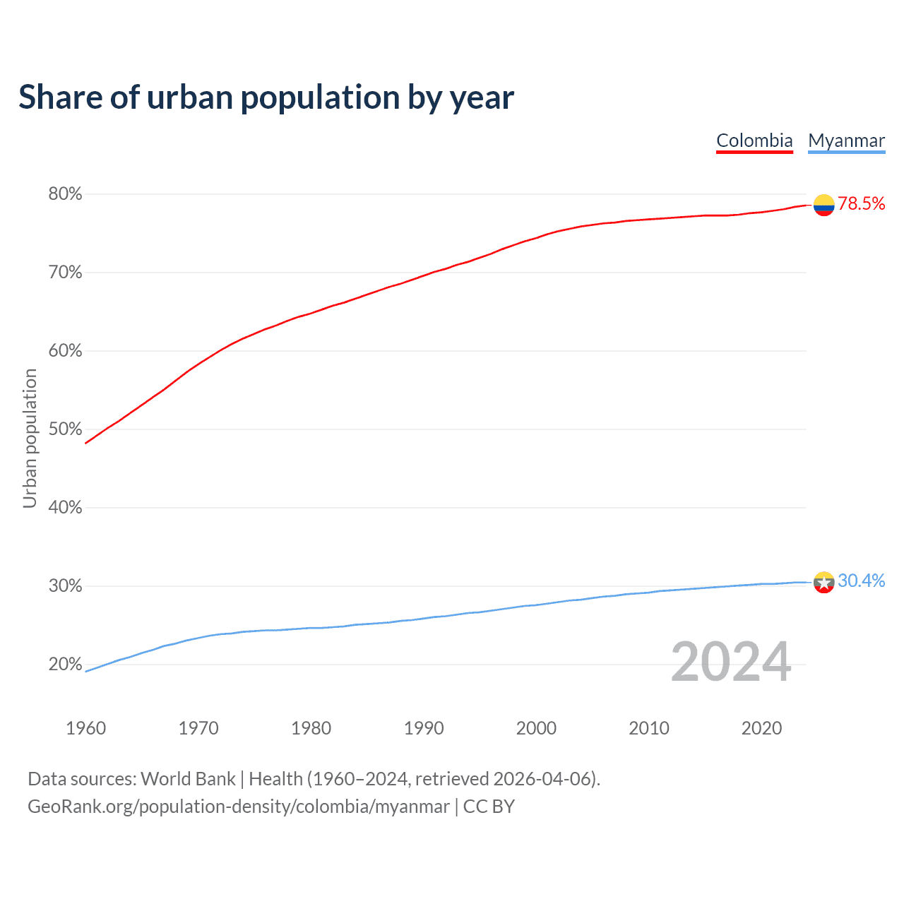 From 2004 to 2024, the share of urban population changed from 75.8% to 78.5% in Colombia and from 28.2% to 30.4% in Myanmar.