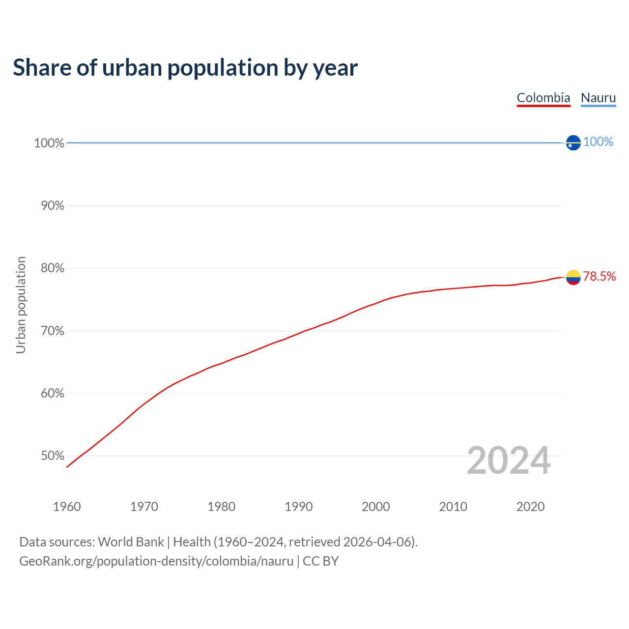 From 2004 to 2024, the share of urban population changed from 75.8% to 78.5% in Colombia and from 100% to 100% in Nauru.