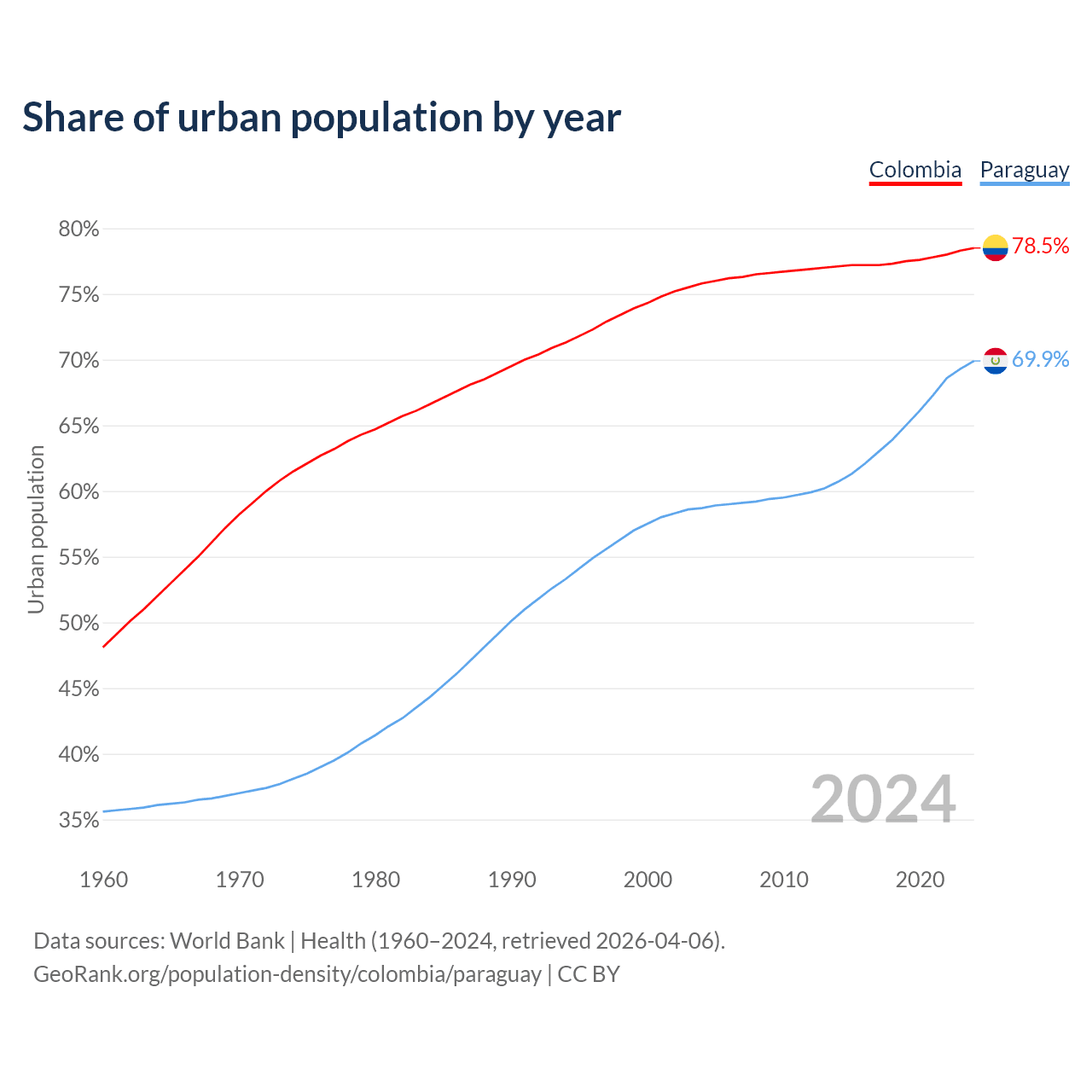 From 2004 to 2024, the share of urban population changed from 75.8% to 78.5% in Colombia and from 58.7% to 69.9% in Paraguay.