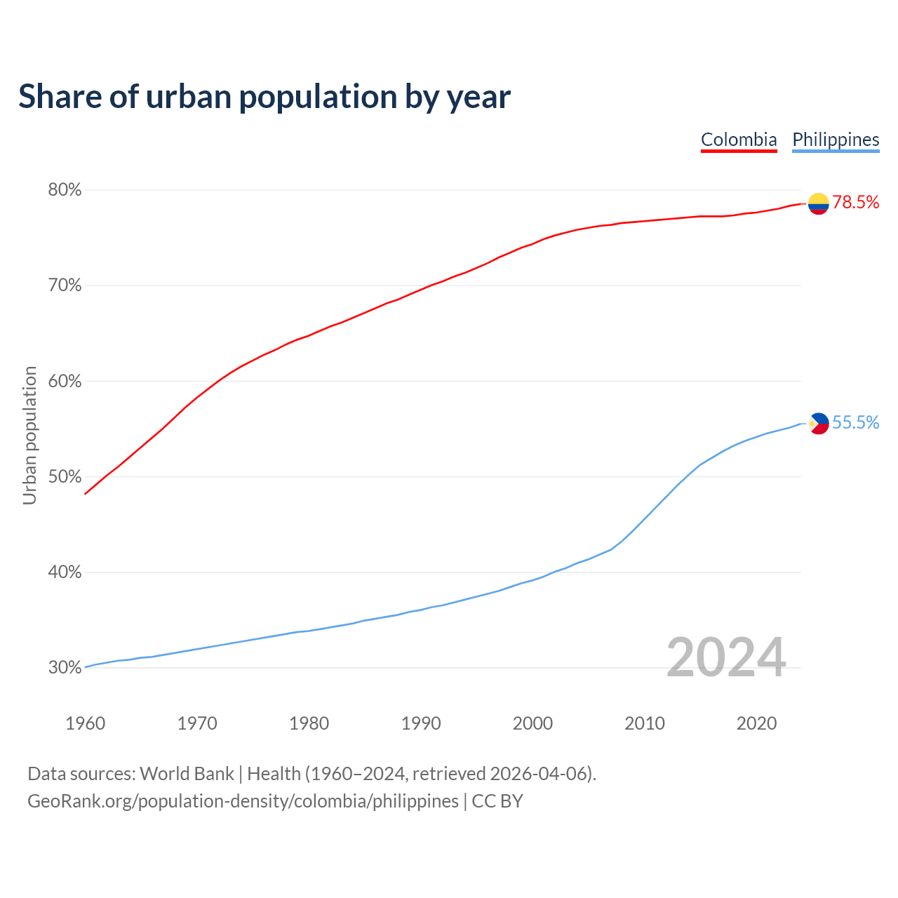 From 2004 to 2024, the share of urban population changed from 75.8% to 78.5% in Colombia and from 40.9% to 55.5% in the Philippines.