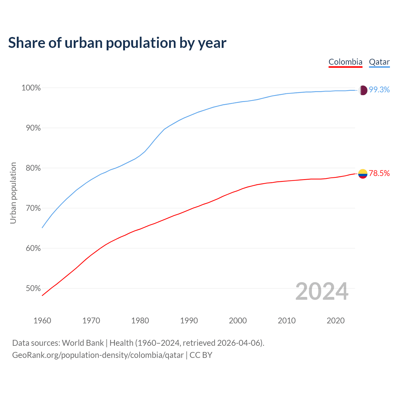 From 2004 to 2024, the share of urban population changed from 75.8% to 78.5% in Colombia and from 97% to 99.3% in Qatar.