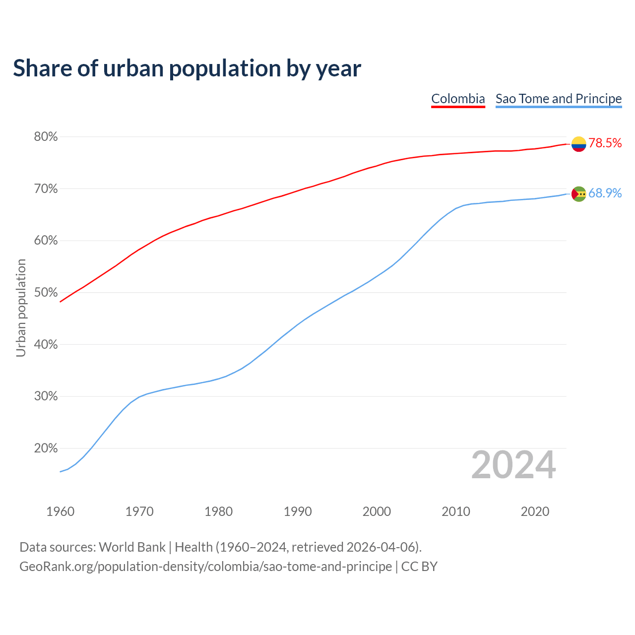 From 2004 to 2024, the share of urban population changed from 75.8% to 78.5% in Colombia and from 57.9% to 68.9% in Sao Tome and Principe.