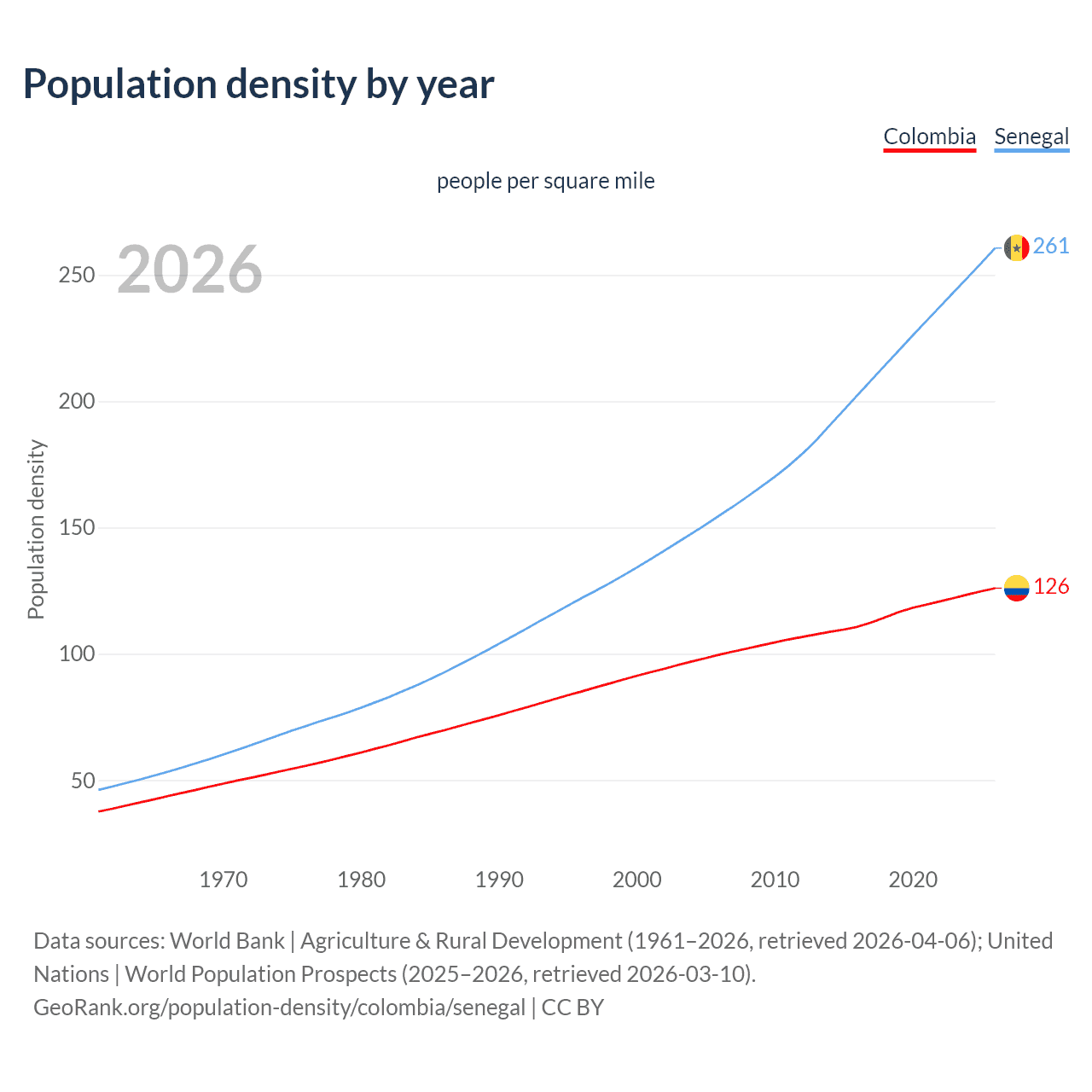 From 2006 to 2026, population density in Colombia increased by 26.4%, compared to a 68.5% growth in Senegal.