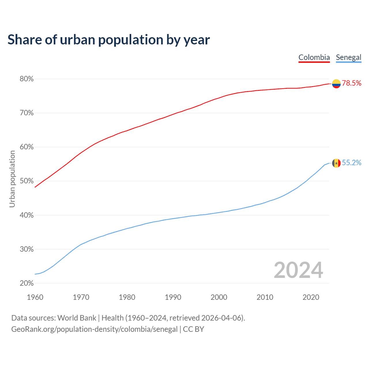 From 2004 to 2024, the share of urban population changed from 75.8% to 78.5% in Colombia and from 41.6% to 55.2% in Senegal.