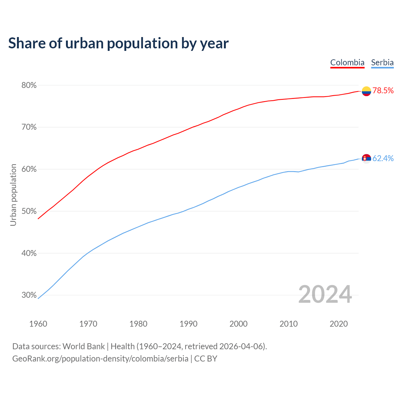 From 2004 to 2024, the share of urban population changed from 75.8% to 78.5% in Colombia and from 57.3% to 62.4% in Serbia.