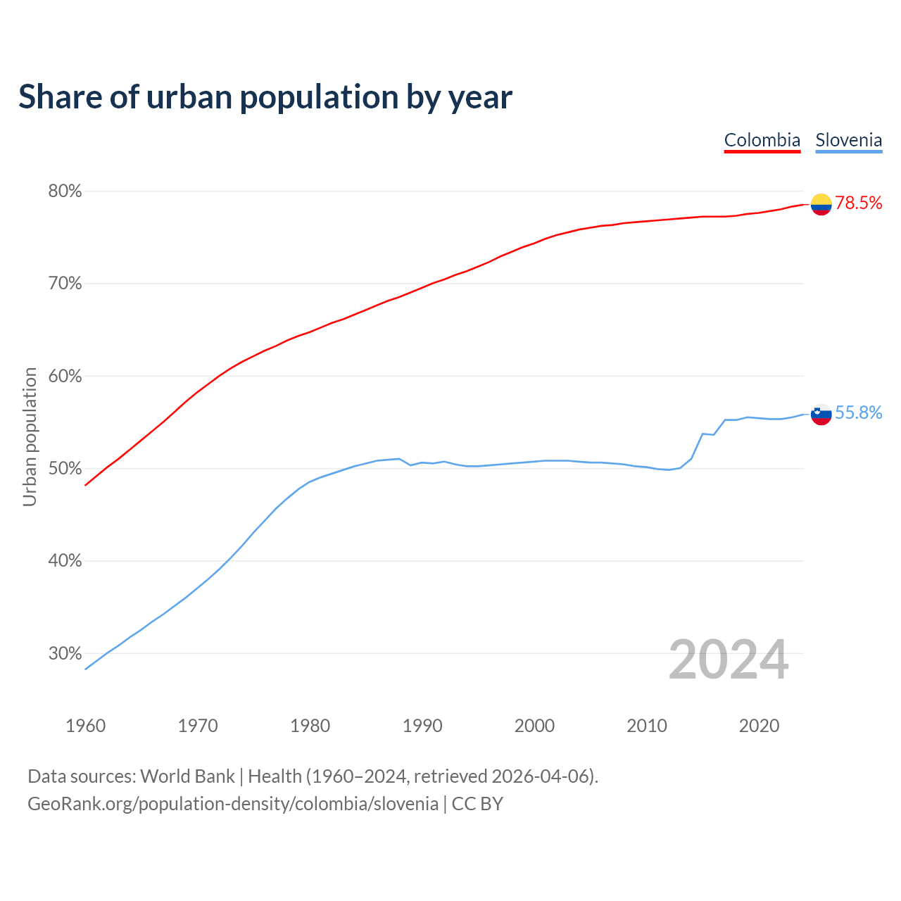 From 2004 to 2024, the share of urban population changed from 75.8% to 78.5% in Colombia and from 50.7% to 55.8% in Slovenia.