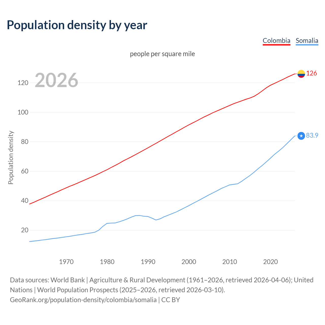 From 2006 to 2026, population density in Colombia increased by 26.4%, compared to a 85.2% growth in Somalia.