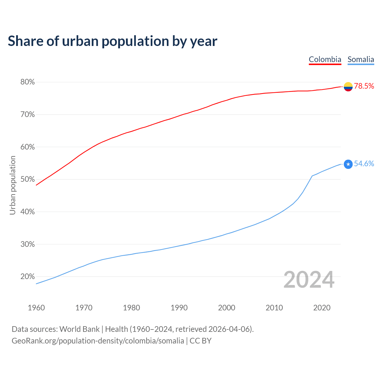 From 2004 to 2024, the share of urban population changed from 75.8% to 78.5% in Colombia and from 35% to 54.6% in Somalia.