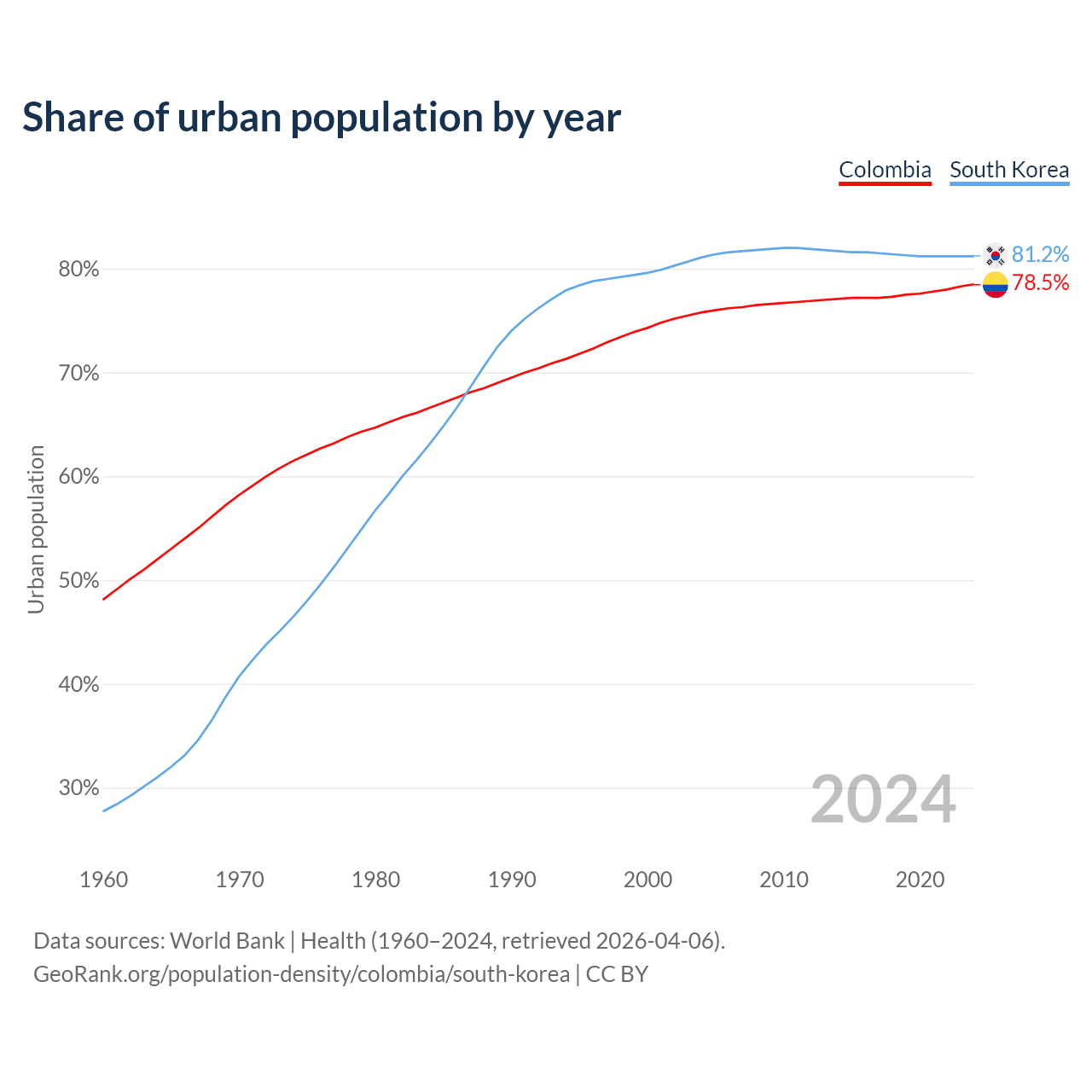 From 2004 to 2024, the share of urban population changed from 75.8% to 78.5% in Colombia and from 81.1% to 81.2% in South Korea.