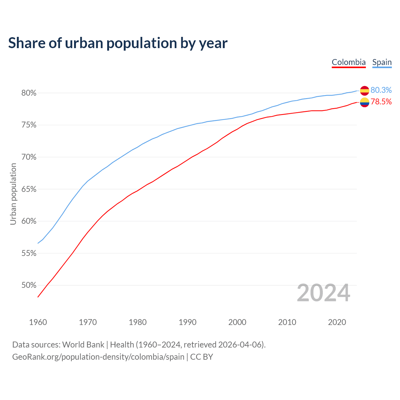 From 2004 to 2024, the share of urban population changed from 75.8% to 78.5% in Colombia and from 77% to 80.3% in Spain.