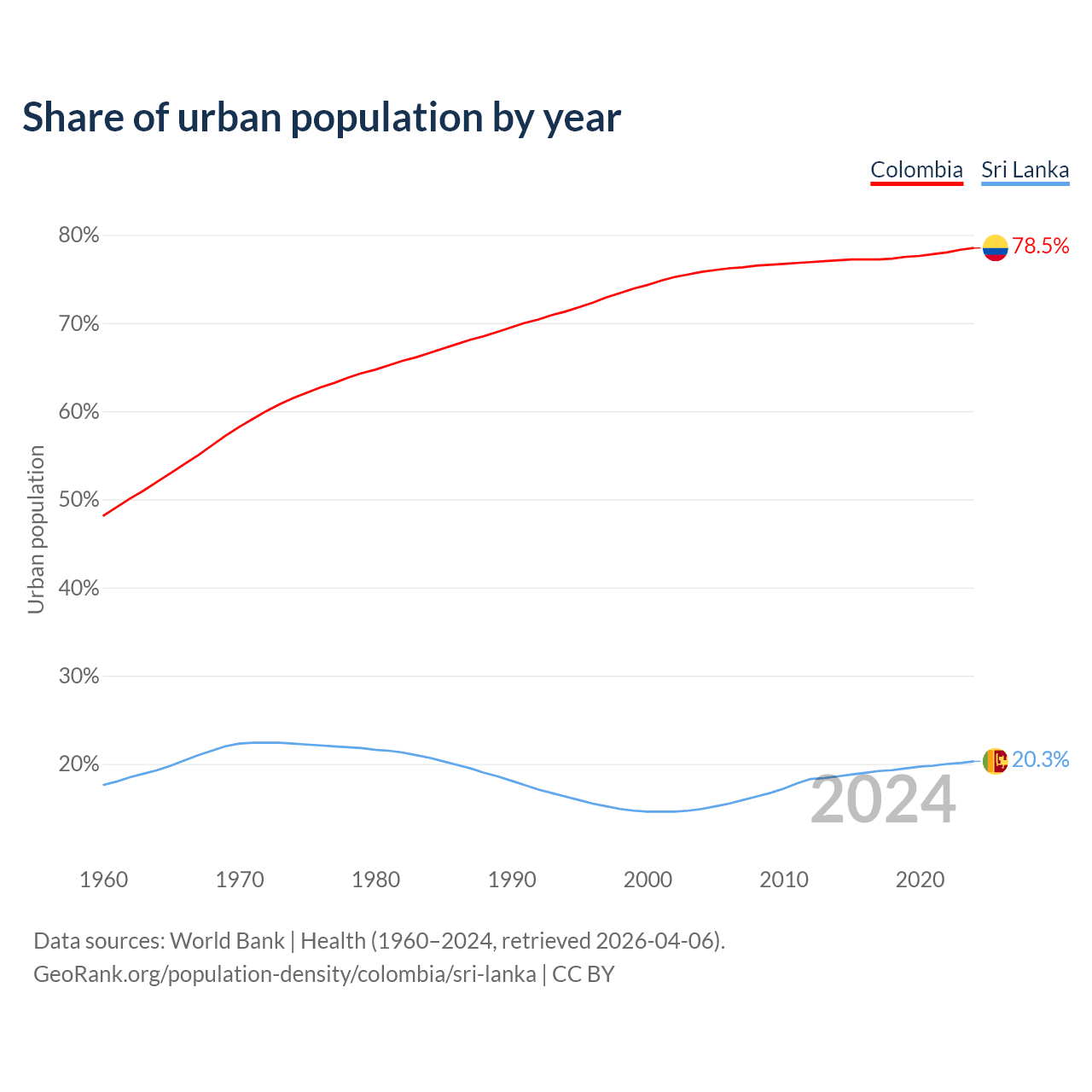 From 2004 to 2024, the share of urban population changed from 75.8% to 78.5% in Colombia and from 14.9% to 20.3% in Sri Lanka.