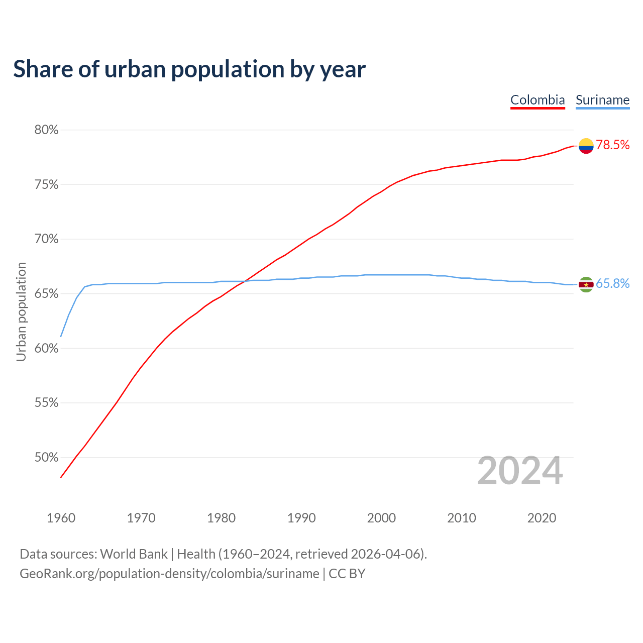 From 2004 to 2024, the share of urban population changed from 75.8% to 78.5% in Colombia and from 66.7% to 65.8% in Suriname.