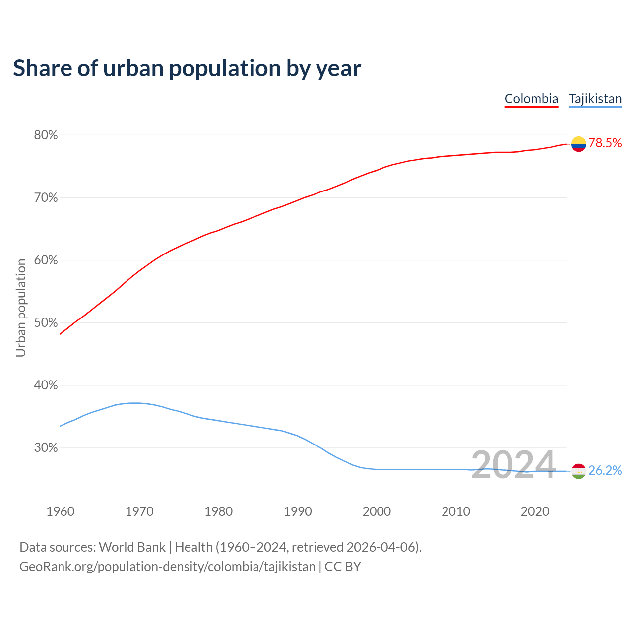 From 2004 to 2024, the share of urban population changed from 75.8% to 78.5% in Colombia and from 26.5% to 26.2% in Tajikistan.