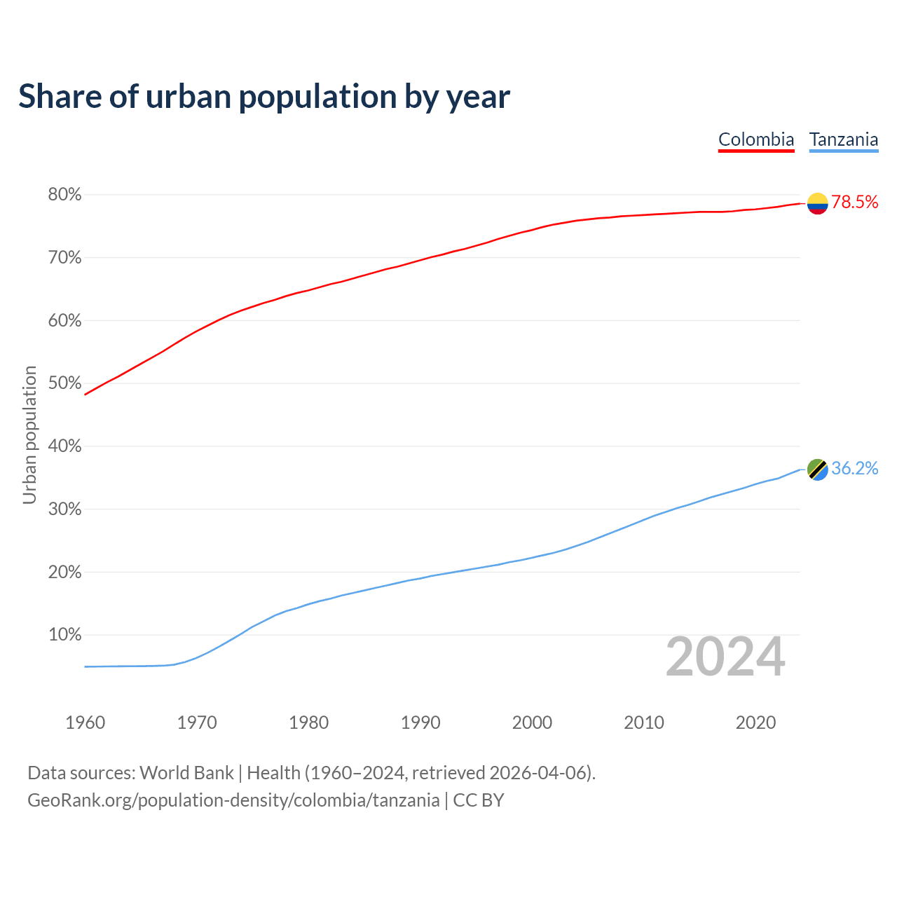 From 2004 to 2024, the share of urban population changed from 75.8% to 78.5% in Colombia and from 24.1% to 36.2% in Tanzania.