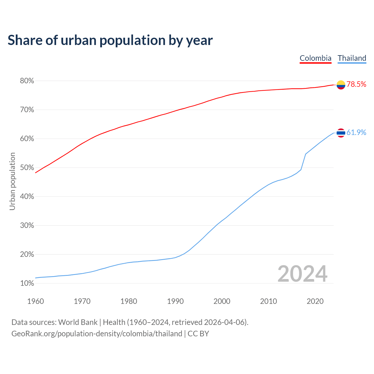 From 2004 to 2024, the share of urban population changed from 75.8% to 78.5% in Colombia and from 36.8% to 61.9% in Thailand.