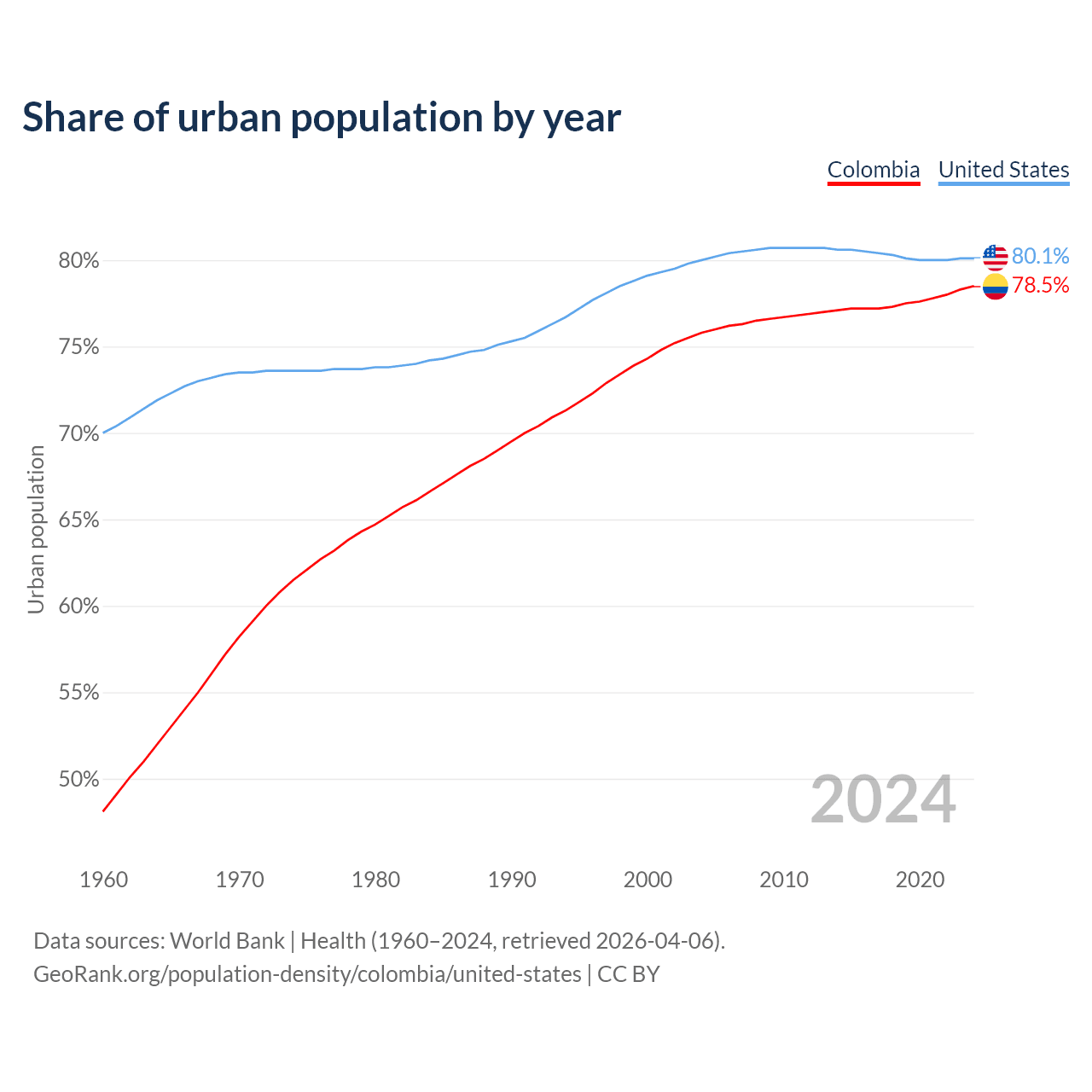From 2004 to 2024, the share of urban population changed from 75.8% to 78.5% in Colombia and from 80% to 80.1% in the United States.
