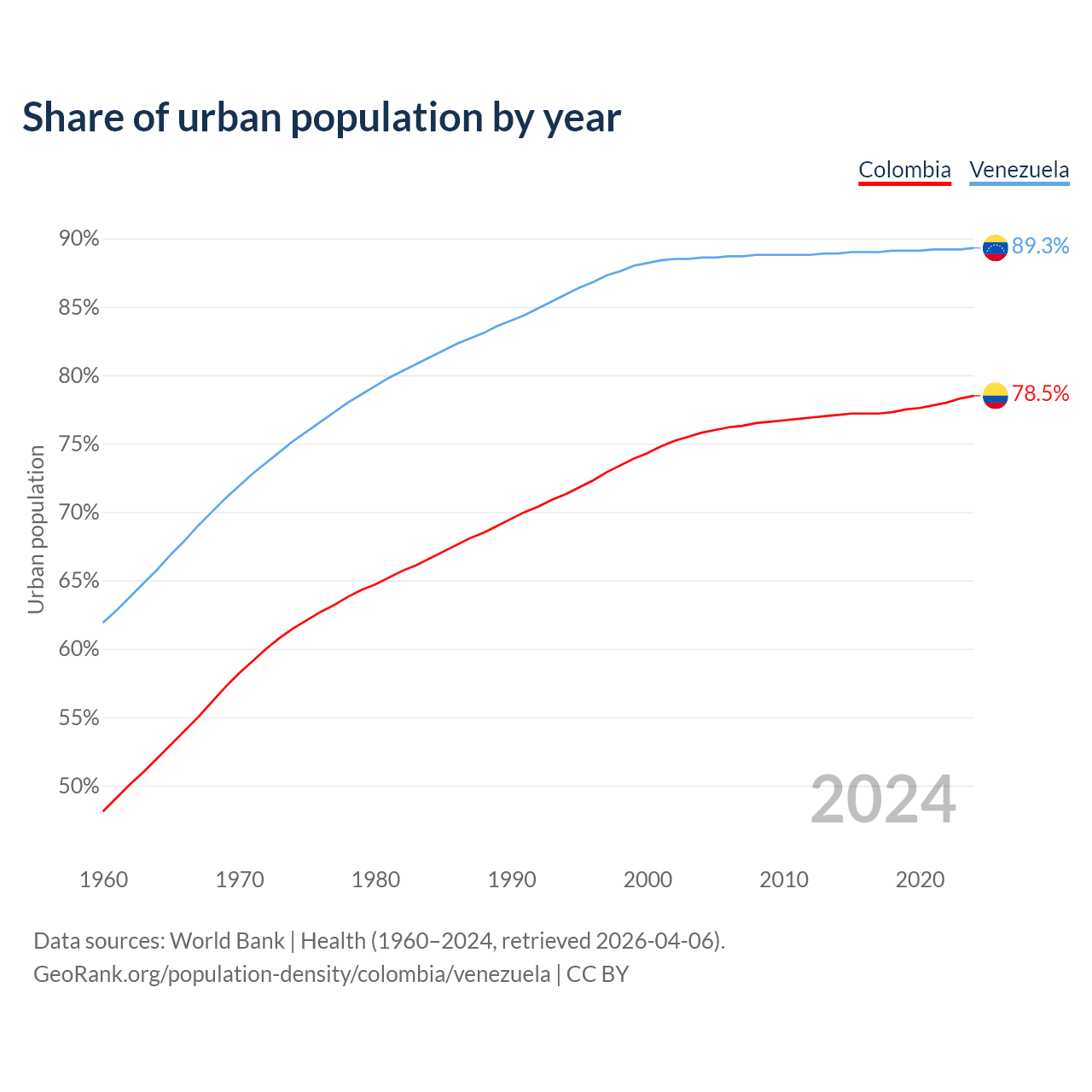 From 2004 to 2024, the share of urban population changed from 75.8% to 78.5% in Colombia and from 88.6% to 89.3% in Venezuela.
