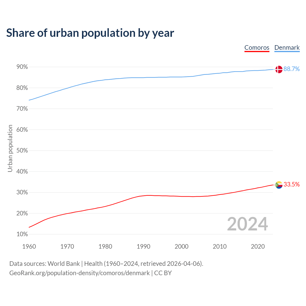 From 2004 to 2024, the share of urban population changed from 28% to 33.5% in Comoros and from 85.7% to 88.7% in Denmark.