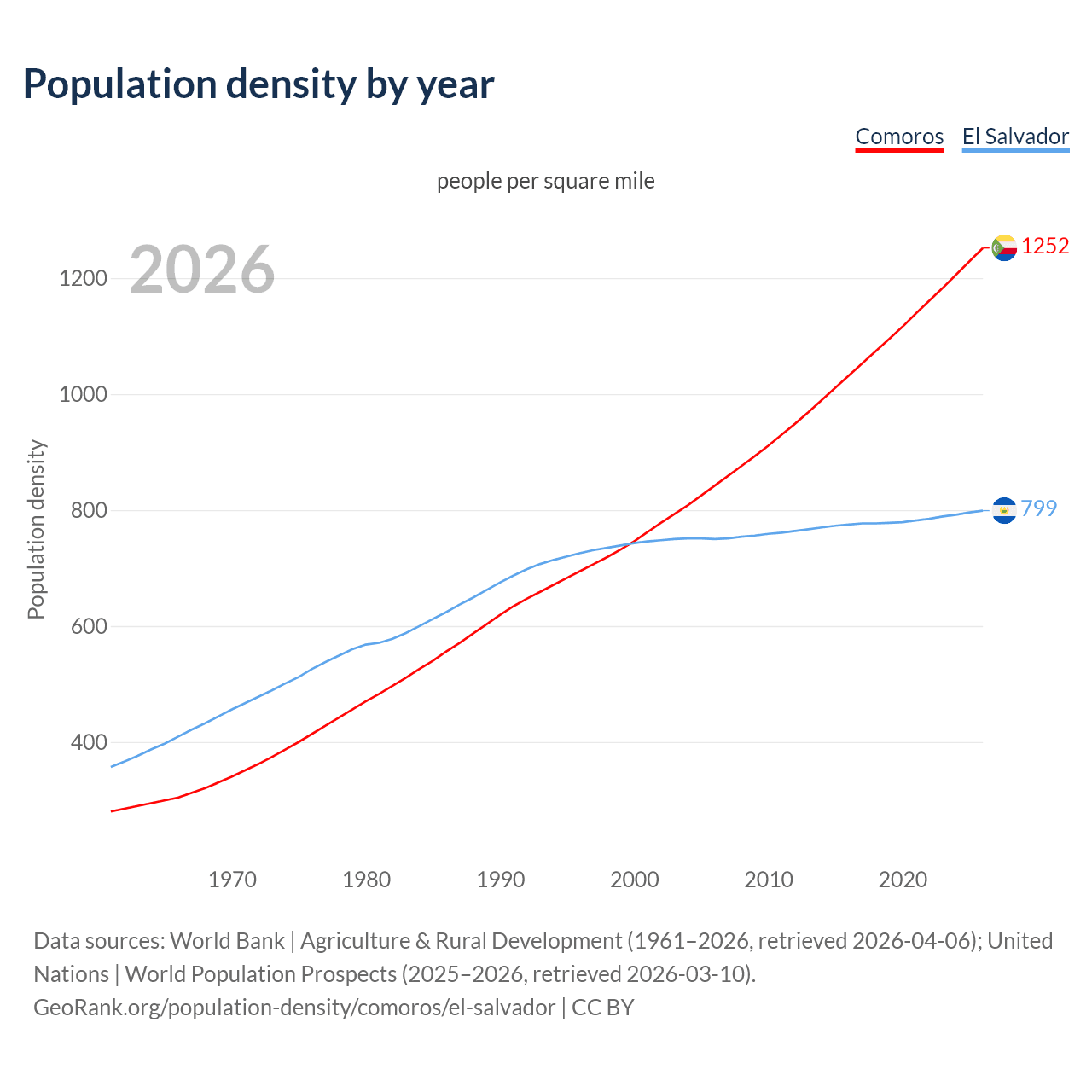 From 2006 to 2026, population density in Comoros increased by 48.7%, compared to a 6.51% growth in El Salvador.