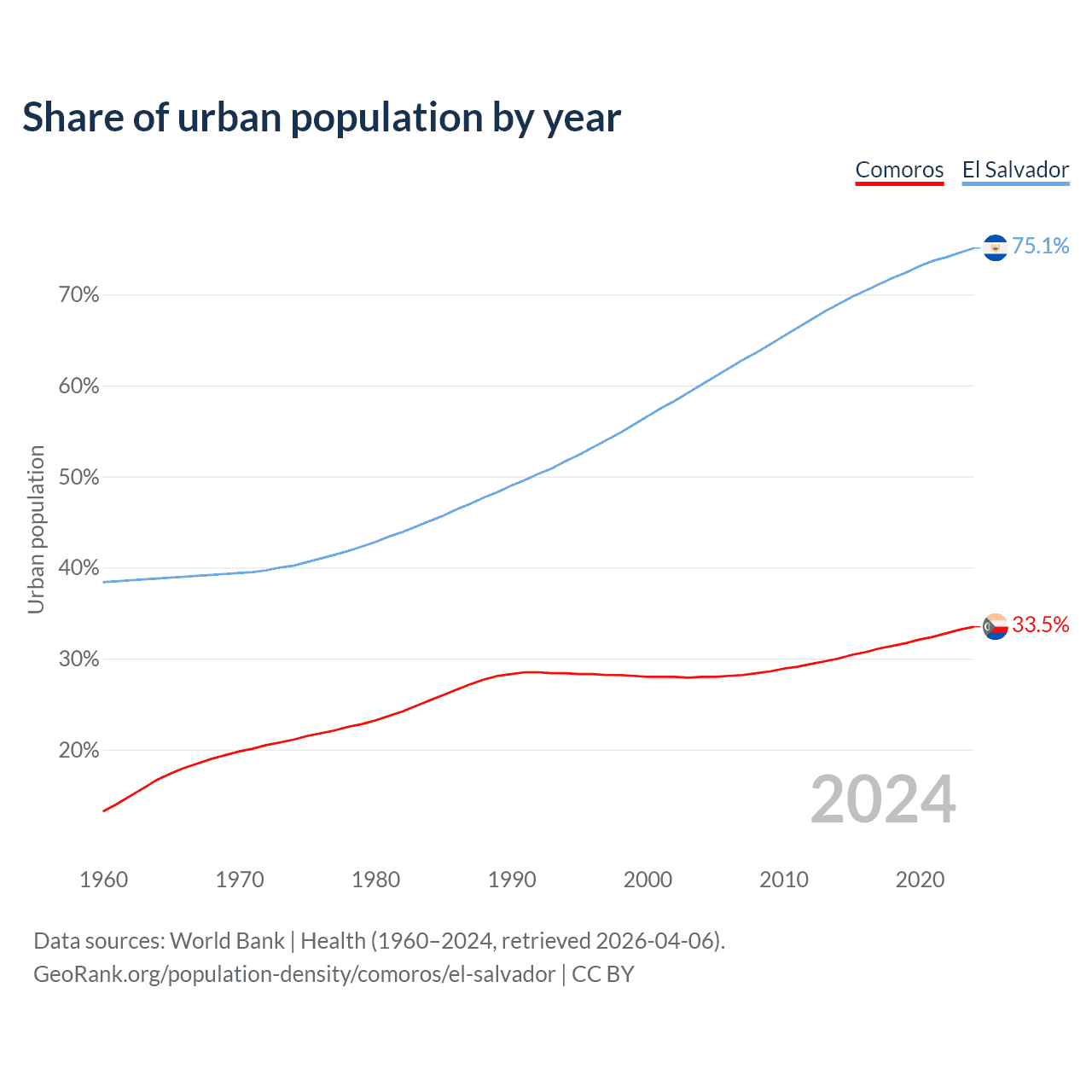 From 2004 to 2024, the share of urban population changed from 28% to 33.5% in Comoros and from 60.1% to 75.1% in El Salvador.