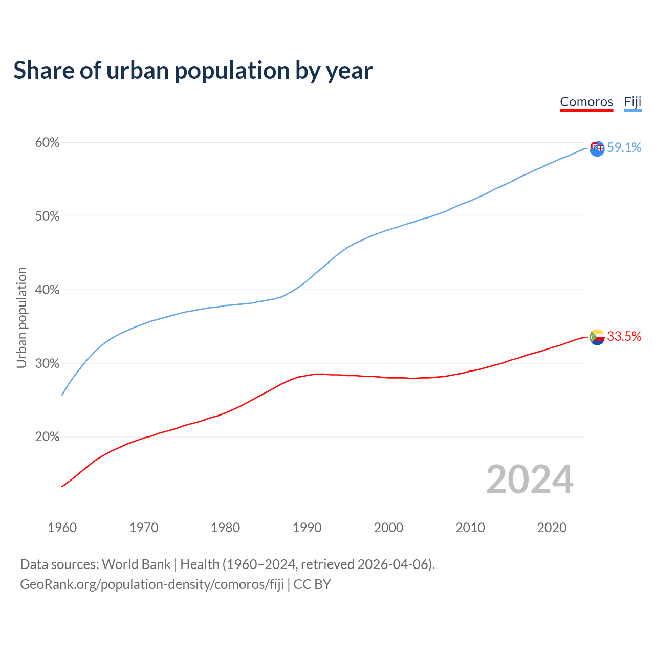 From 2004 to 2024, the share of urban population changed from 28% to 33.5% in Comoros and from 49.5% to 59.1% in Fiji.
