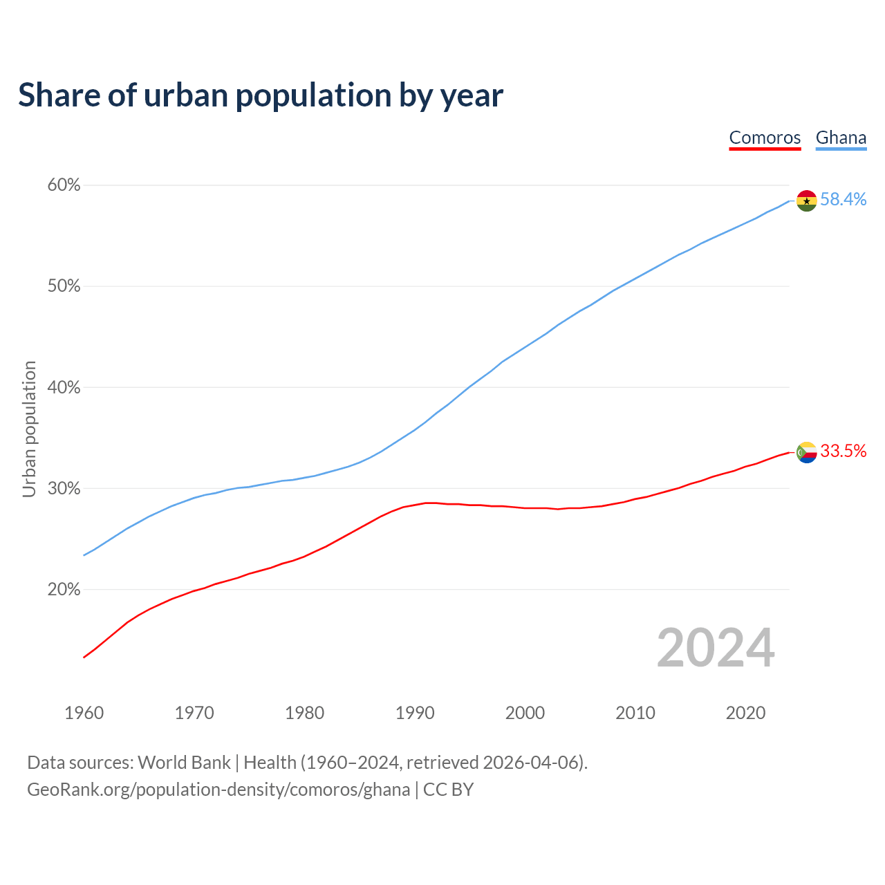 From 2004 to 2024, the share of urban population changed from 28% to 33.5% in Comoros and from 46.8% to 58.4% in Ghana.
