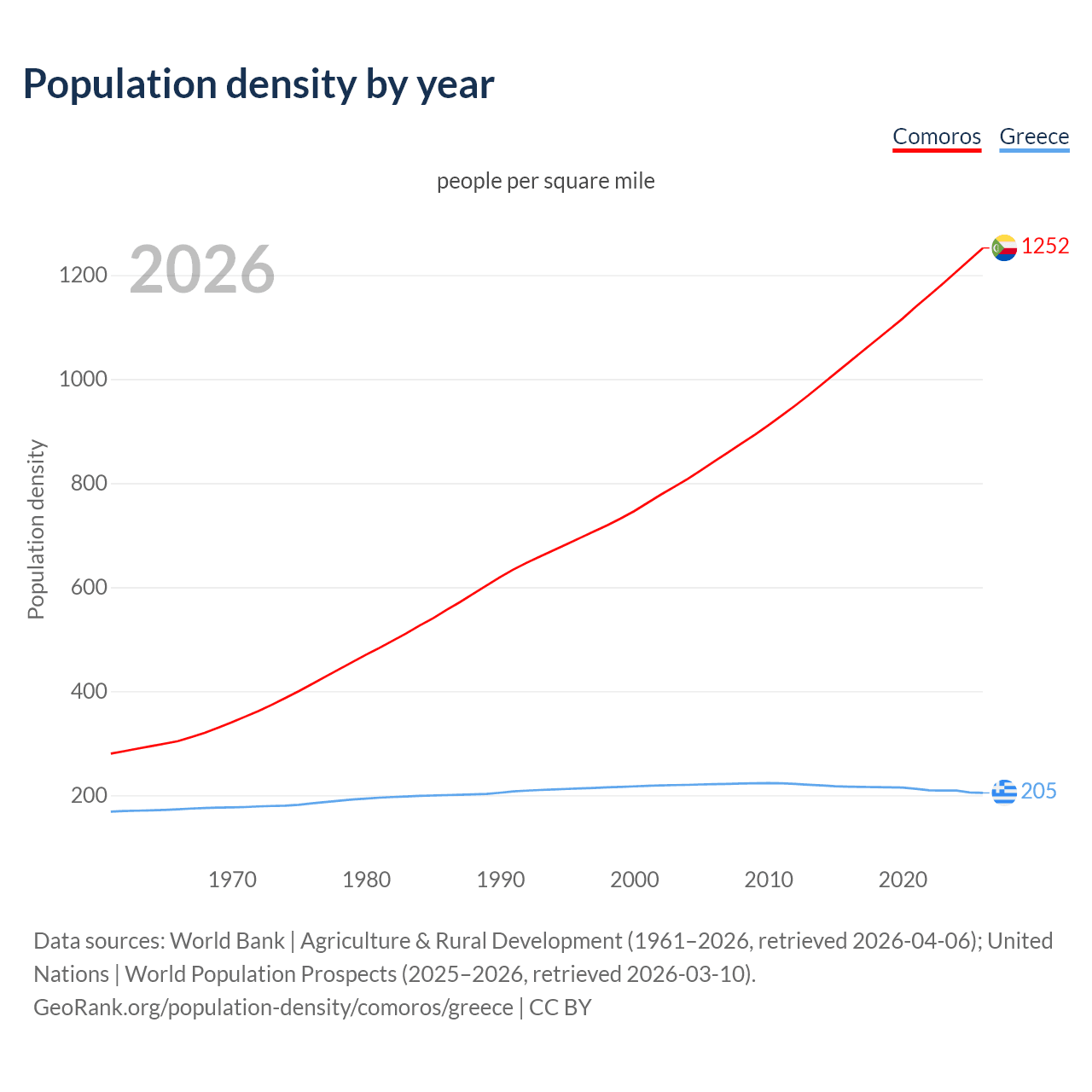 From 2006 to 2026, population density in Comoros increased by 48.7%, compared to a 7.61% decline in Greece.