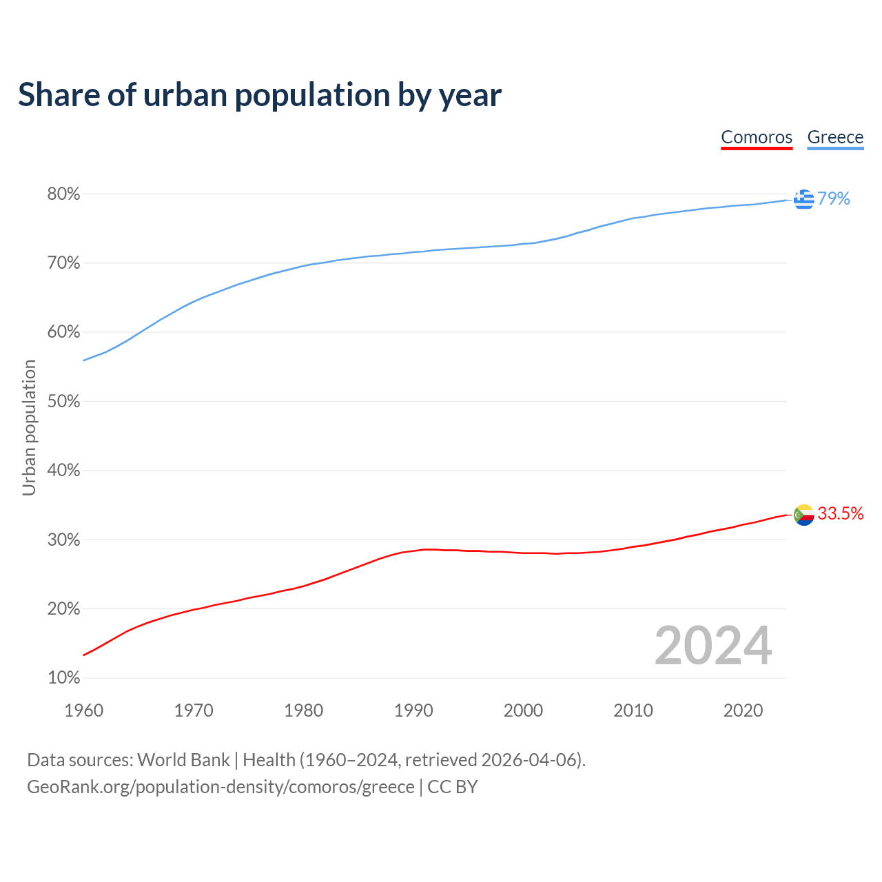 From 2004 to 2024, the share of urban population changed from 28% to 33.5% in Comoros and from 73.8% to 79% in Greece.