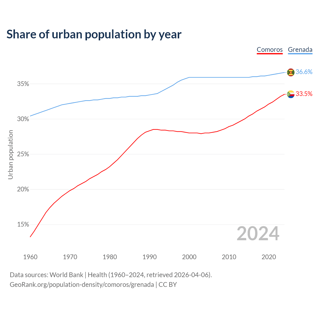 From 2004 to 2024, the share of urban population changed from 28% to 33.5% in Comoros and from 35.9% to 36.6% in Grenada.