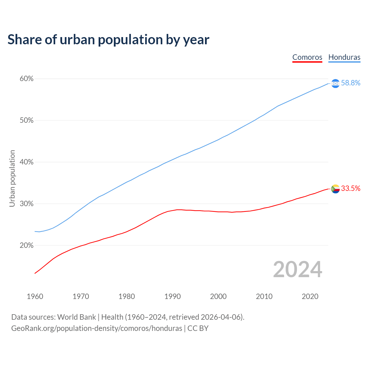 From 2004 to 2024, the share of urban population changed from 28% to 33.5% in Comoros and from 47.6% to 58.8% in Honduras.