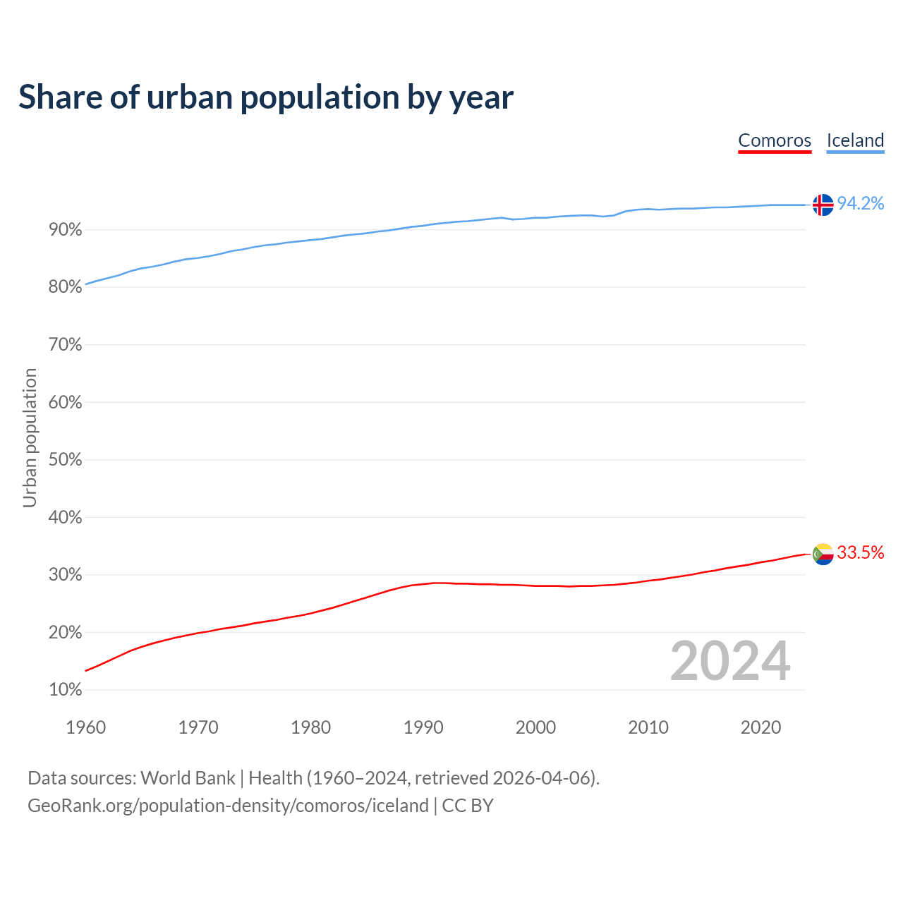 From 2004 to 2024, the share of urban population changed from 28% to 33.5% in Comoros and from 92.4% to 94.2% in Iceland.