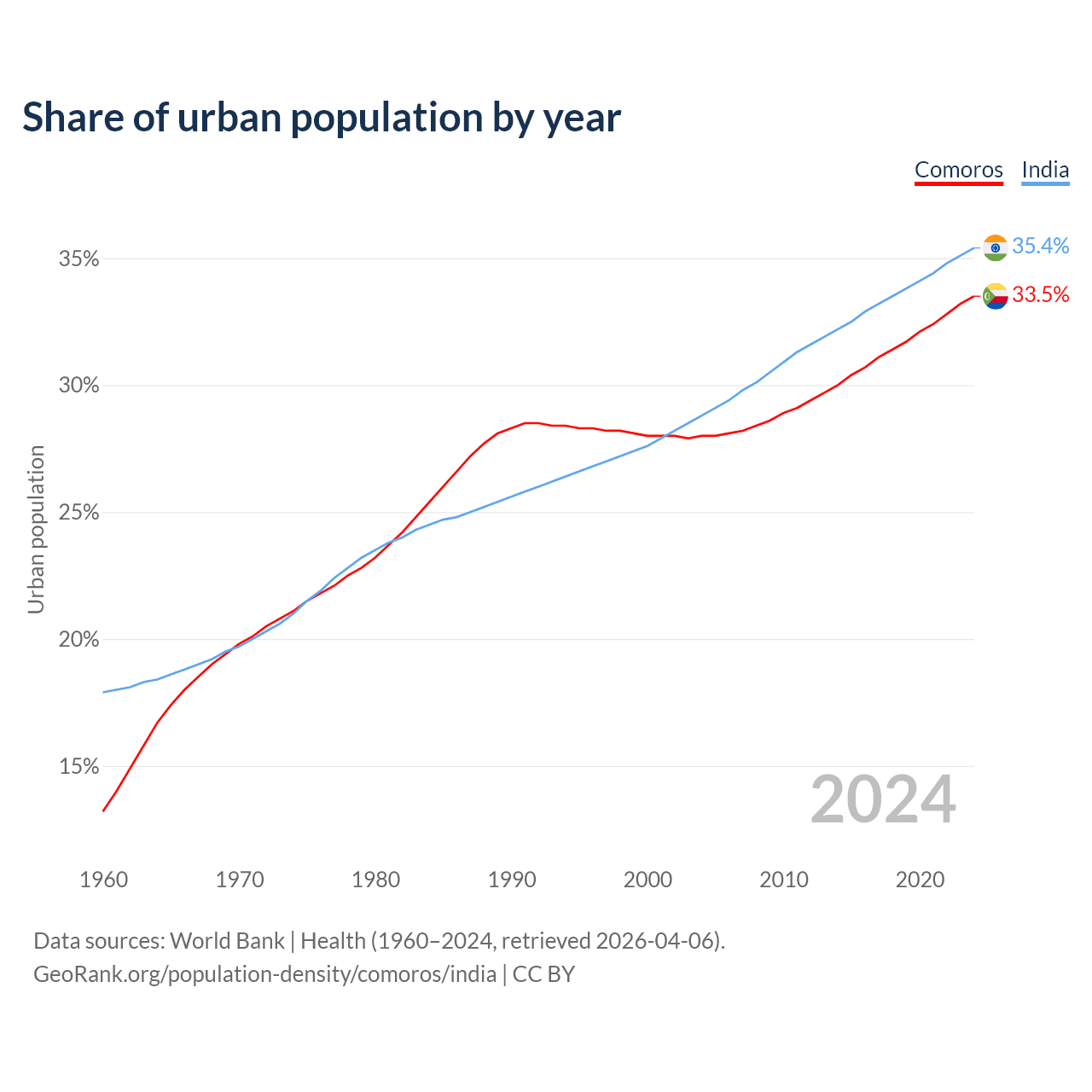 From 2004 to 2024, the share of urban population changed from 28% to 33.5% in Comoros and from 28.8% to 35.4% in India.