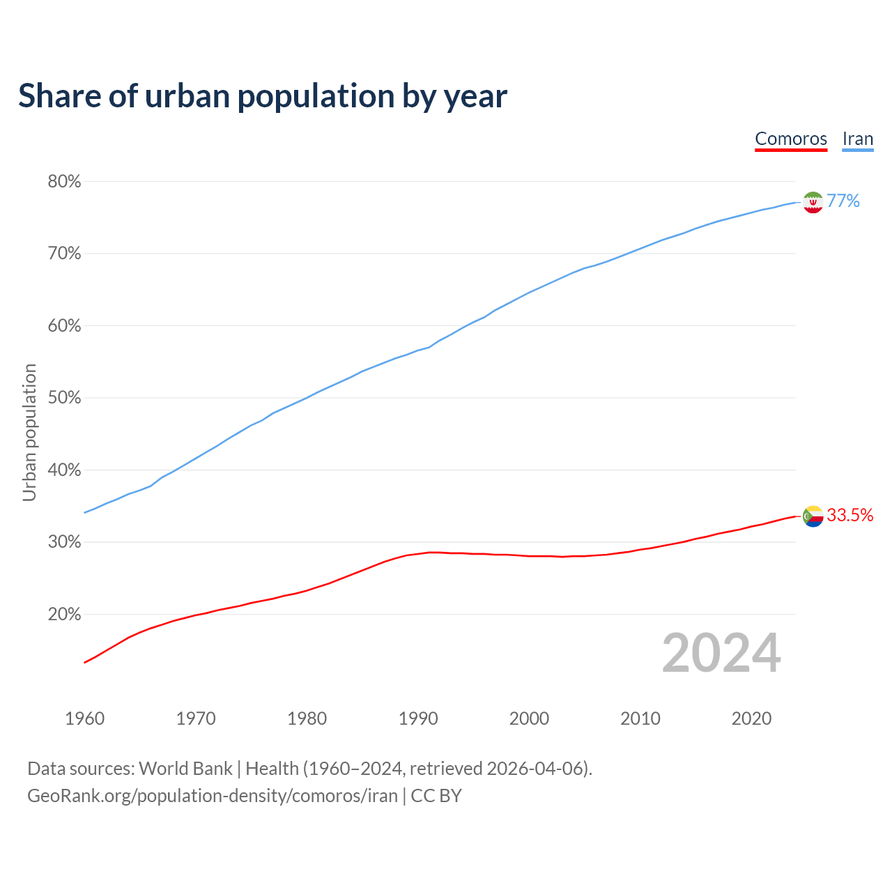From 2004 to 2024, the share of urban population changed from 28% to 33.5% in Comoros and from 67.3% to 77% in Iran.